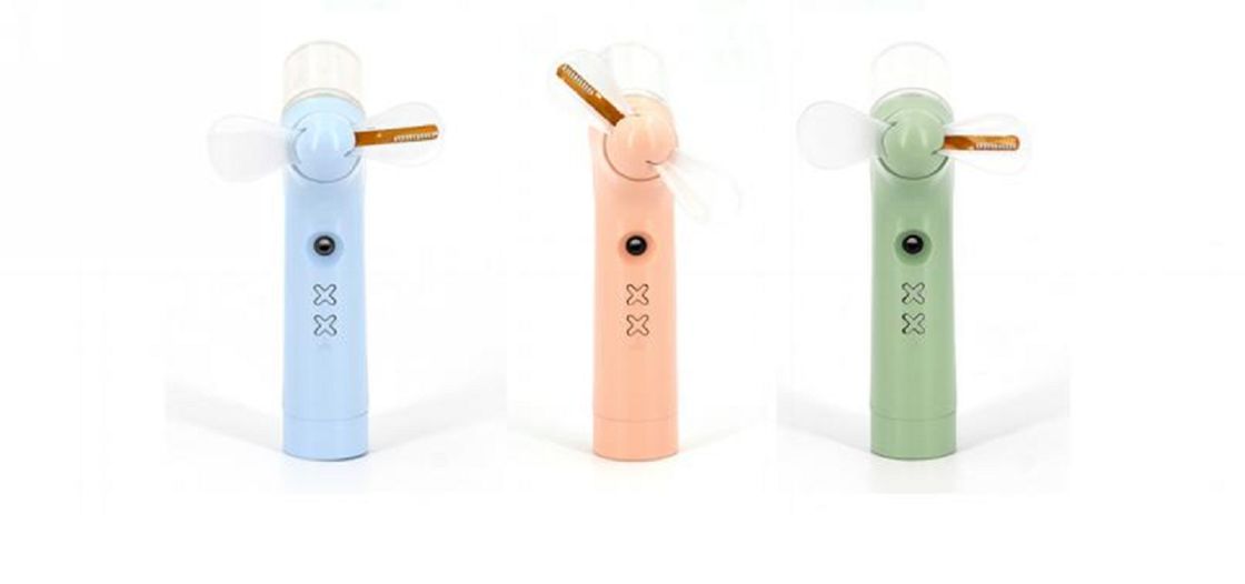 Compact rechargeable handheld fan made of ABS + PVC + electronic components, featuring a 1200mAh lithium battery for extended use. Equipped with a brushed motor and USB charging (DC 5V), it fully charges in 1 hour and operates for up to 2 hours. Offers one wind-speed setting, built-in spray mist function, and flashing LED characters for added fun. Available in blue, pink, and green.